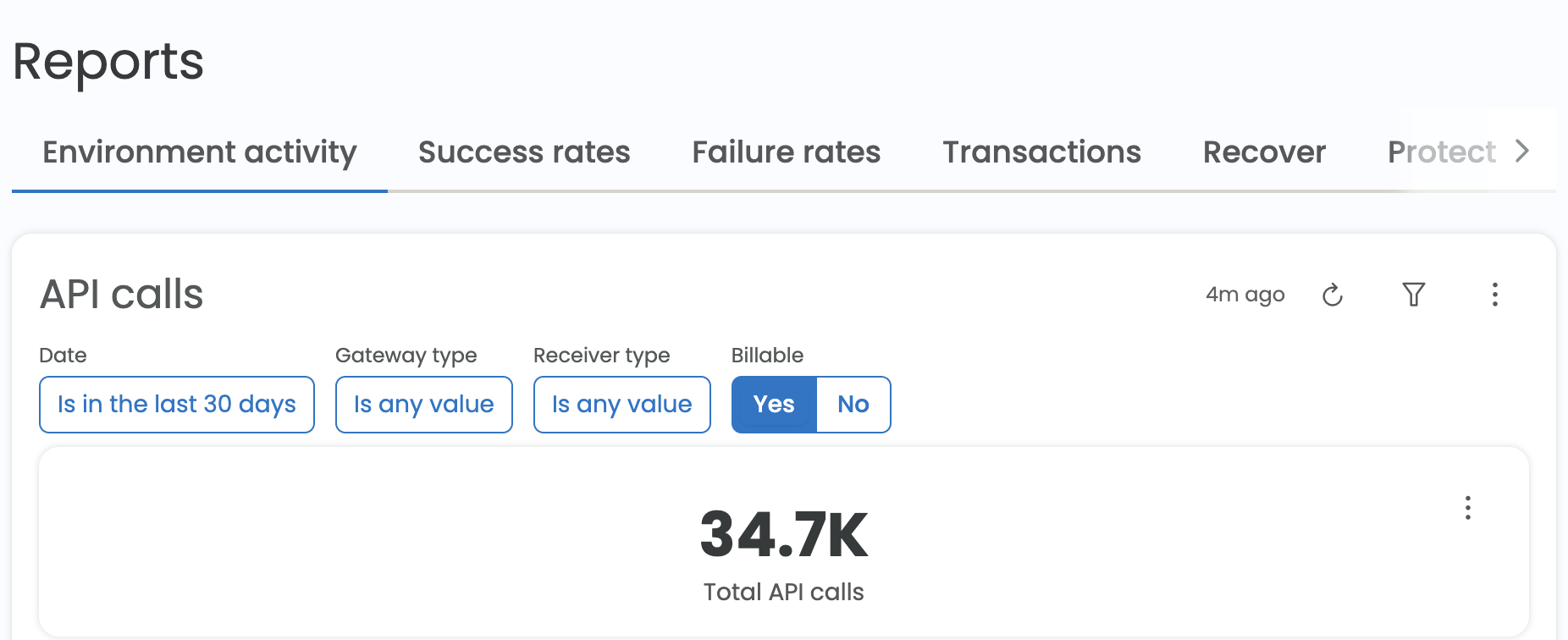 Environment activity reports include filters for date, gateway type, receiver type, and billable activity. The date filter offers multiple control conditions to index recent API calls in an environment. The gateway and receiver filters can be used include or omit a given PSP from the report. The billable toggle will filter out process-oriented calls applicable only to Spreedly Advanced Vault customers, including update_gratis, card_refresher inquiries and some Network token activity. Spreedly does not differentiate between test and production activity for billing purposes.